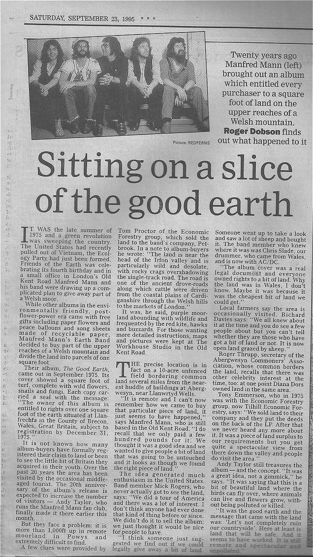 Ian told me that some chap from The Guardian had called and he had given him my number. He was interesting in writing an article to celebrat-e the twentieth ann-iversary of the album, ‘The Good Earth’ and its unusual free gift. A few minutes after I had put the phone down Roger Dobson called. I felt unprepared for such an interview and I must have been a huge disappointment to Roger. You see as I confessed earlier I had never been to see our plot of land and wasn’t even sure where it was. It didn’t matter how many times he asked,