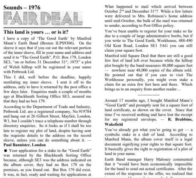 I would of course revisit the album now and again as I did and still do with all the albums. In a world that now had “Martha’s Madman”, “Don’t Kill It Carol” and “Blinded By The Light” and a band that was now recognised as one of the best live acts around, ‘The Good Earth’ could easily be lost in the back catalogue. Worse still, I never got round to sending for my square foot. There was apparently a problem managing the process, the demand being far higher than was expected. In the end I believe everybody got their square foot of land including me although at the time I don’t think I knew that.
