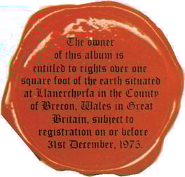 square foot of the earth situated at Llanerchyrfa in the County of Brecon, in Wales. The inner sleeve included a coupon that had to be sent for registration. This was part of the promotion